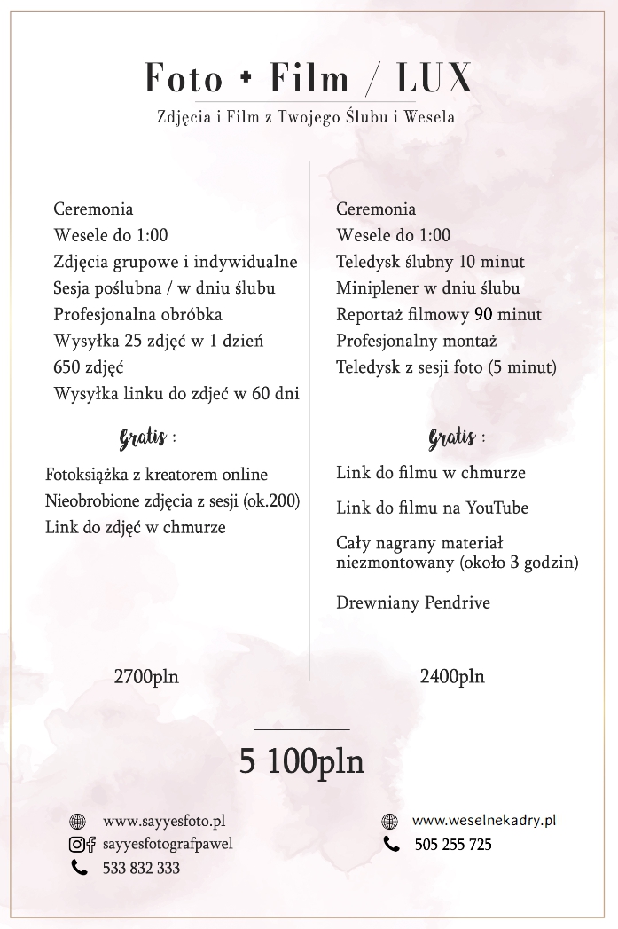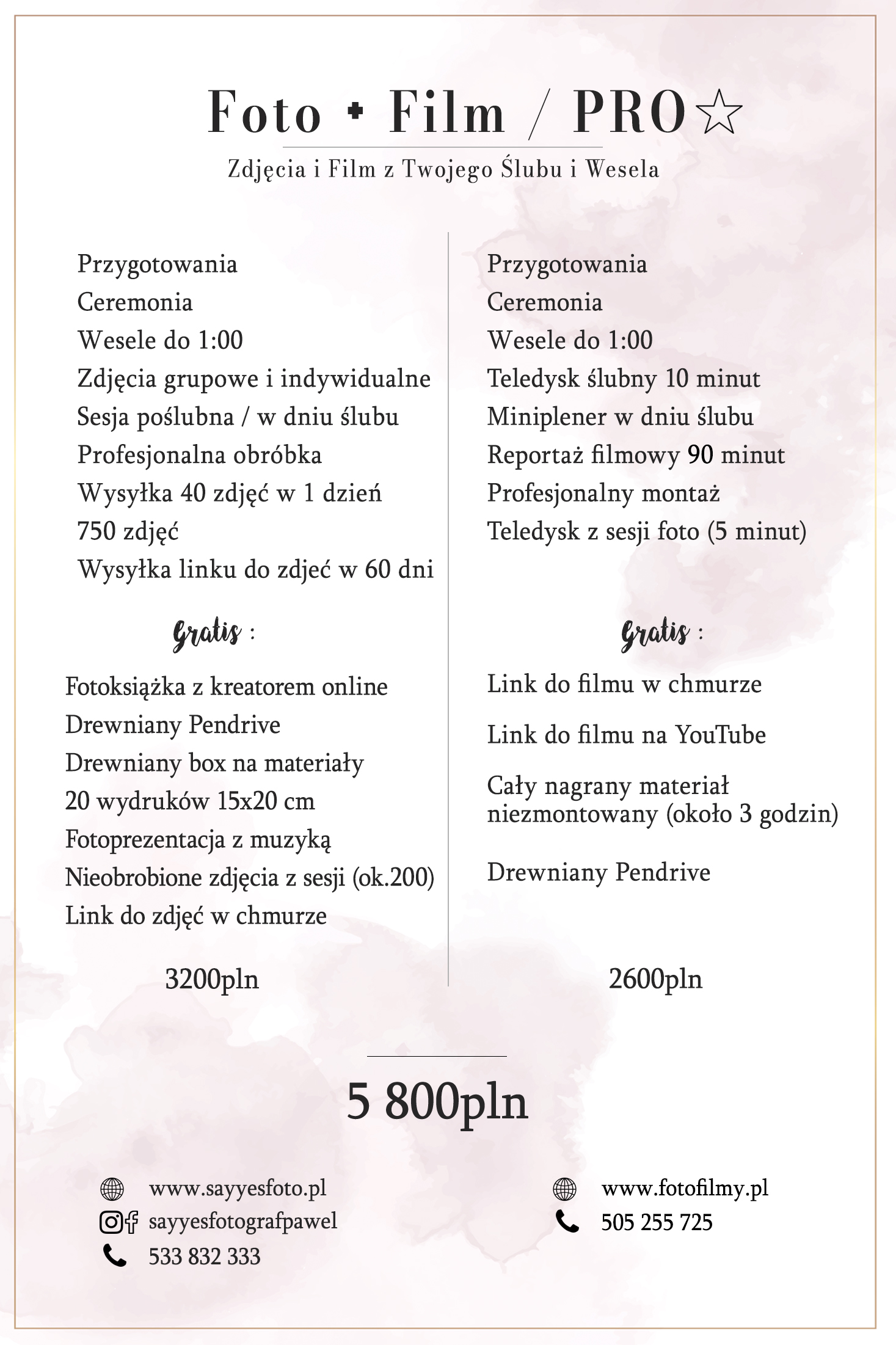 | Filmowanie w dniu ślubu, obejmujące przygotowania, ceremonię i przyjęcie – do 12 godzin. |